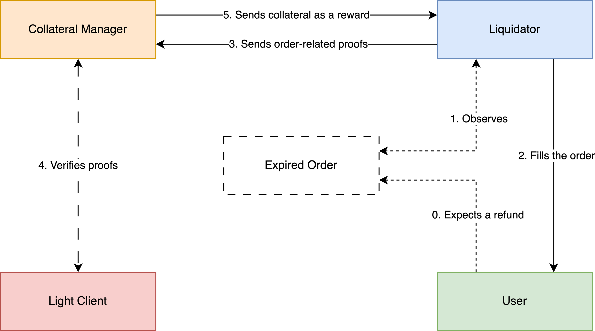 Note that the Liquidator in this flow may call both report and slash methods. The main share of the order collateral still goes to the User in this case. At the same time, the Liquidator gets rewarded for performing two transactions with a smaller collateral share as specified in the order.