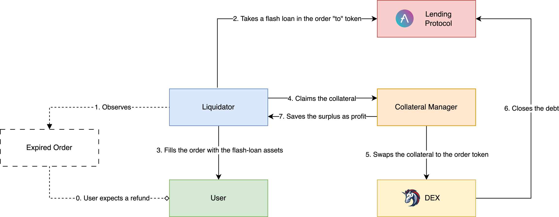 In this flow, a Liquidator fills the expired order by sending their own assets to a User instead of an Intent Agent.
